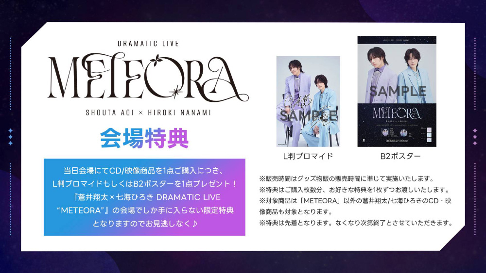 2026年2月4日(水)発売・蒼井翔太×七海ひろき LIVE Blu-ray「蒼井翔太×七海ひろき DRAMATIC LIVE “METEORA”」の特典が下記の通り決定いたしました!